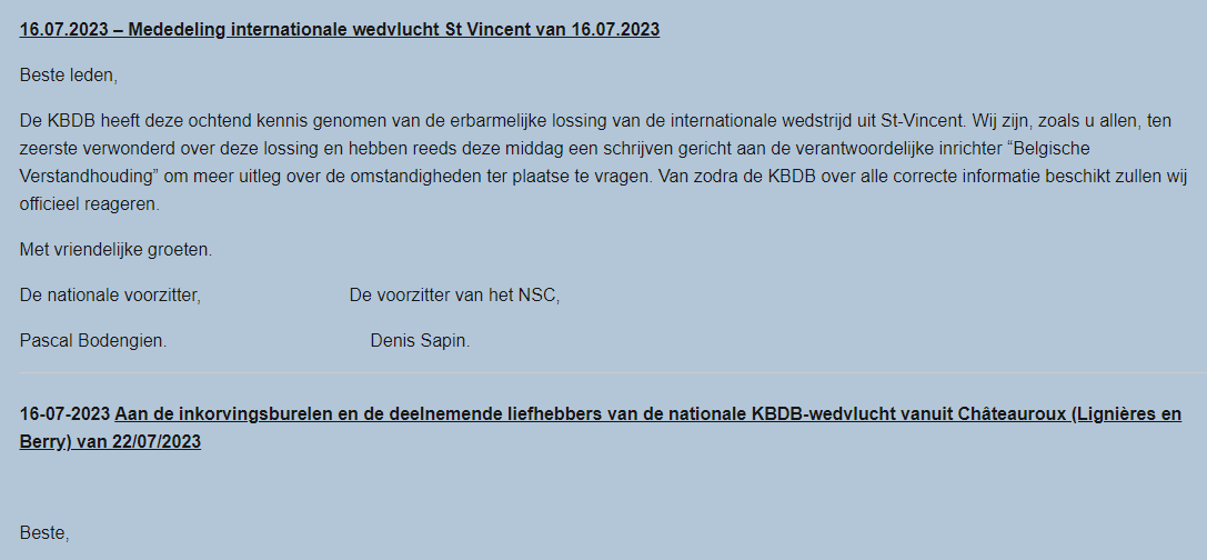 KBDB在官网声明中说:在7月16日上午,KBDB注意到了圣维仙比赛的放飞情况,我们和所有鸽友一样,对这次比赛的司放感到非常惊讶,并已于7月16日下午致信比赛组织者“Belgische Verstandhouding”,要求了解更多有关现场情况的信息。