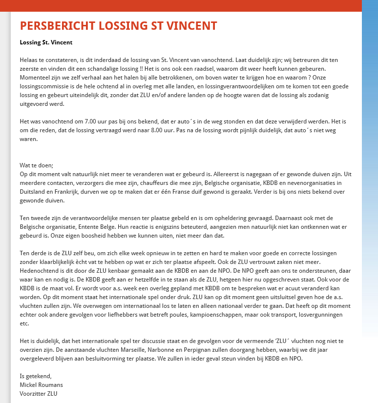 荷兰ZLU长距离赛鸽联盟在自己官网上对此进行了报道,大概内容如下:我们对此表示遗憾,并认为这是一次可耻的司放行为。ZLU第一时间联系了自己司放车的司机、司放员、KBDB、德国以及法国的赛鸽协会,检查是否有受伤的鸽子。其次,ZLU并致电了赛事组织者,要求作出相关的澄清和解释。第三,ZLU对国际赛的司放工作不再信任,并向KBDB和NPO宣布了这一消息。NPO表示,在可能和必要的情况下支持ZLU。KBDB表示他们和ZLU一样,正在调查这个问题。下周ZLU将与KBDB举行会议,讨论可以立即改变的情况,如果无法得到改善,将考虑放弃国际赛,自己组织比赛。但是,考虑到这会对鸽友产生其他影响,包括各类锦标赛、鸽王赛以及运输问题,今年接下来的马赛、拿邦、波品纳的比赛继续进行,仍然由比赛组织者决策决定。