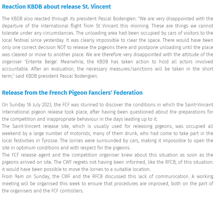 法国鸽友联合会(FCF)同样发布了公告:7月16日周日,在被问及比赛准备情况和比前几天的不当行为后,FCF震惊地发现了圣维仙国际赛放飞条件。整个周末,司放场地被大量前来参加当地庆祝活动的游客汽车占据,司放车被包围,无法在最佳条件下放飞鸽子。司放车一到司放场地,FCF的代表和比赛组织者就知道了这个情况,CWF很遗憾没有像KBDB一样被告知这种情况,本来可以将司放车转移到合适的位置。周日上午9点开出,CWF和KBDB讨论了这周缺乏沟通的问题。这周将组织一次工作会议,以确保比赛程序得到改进。