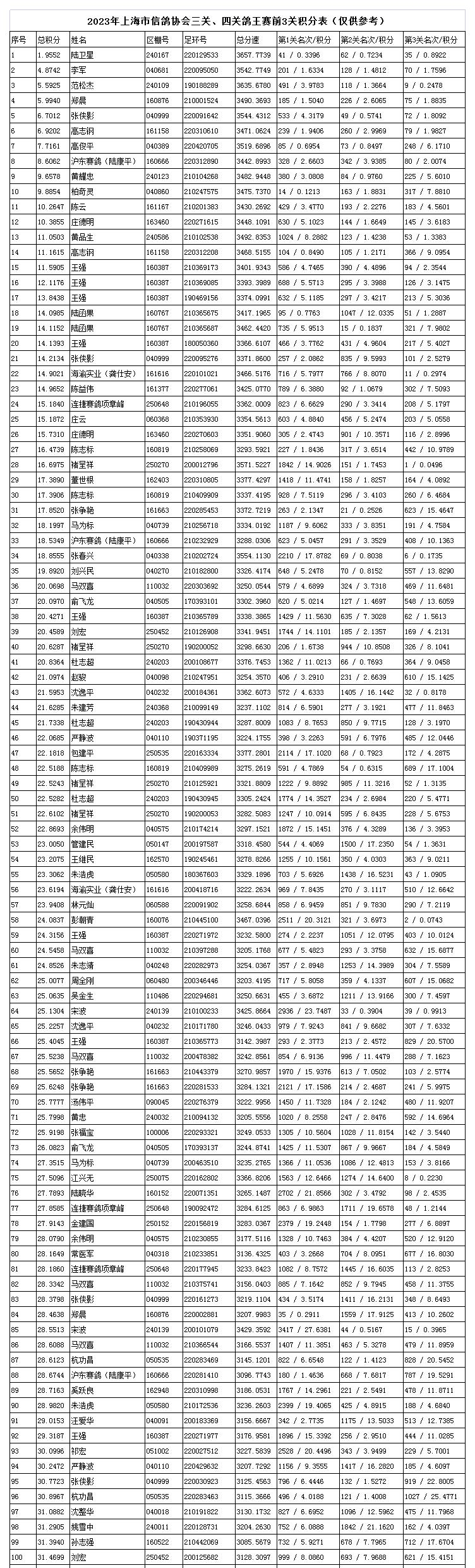 李军的22-0095050赛鸽获得一关201名、二关128名、三关70名,总分速为3542.7749米/分,总积分为4.8742,荣获三关鸽王总亚军。范松杰的19-0188289赛鸽,飞出了一关491名、二关118名、三关9名的好成绩,获得三关鸽王总季军。