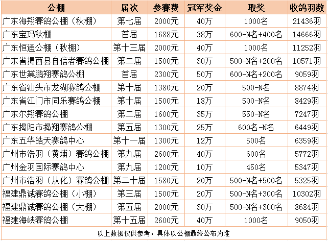 收费不低,奖金也不少。纵观16家秋棚的决赛冠军奖金,10万起步,仅有3家在20万以下,且仅有1家为10万元。超八成秋棚,都将决赛冠军奖金设在20万-50万区间。其中最高的是今年首次举办秋赛的广东世业鹏翔赛鸽公棚,冠军奖励50万元,魄力十足。另有4家决赛冠军奖励40万,也颇具诱惑力!在广东省收鸽榜前五中,三家冠军奖金在40万以上,最低的也有30万,可见冠军奖励也是鸽友交鸽的一大因素。