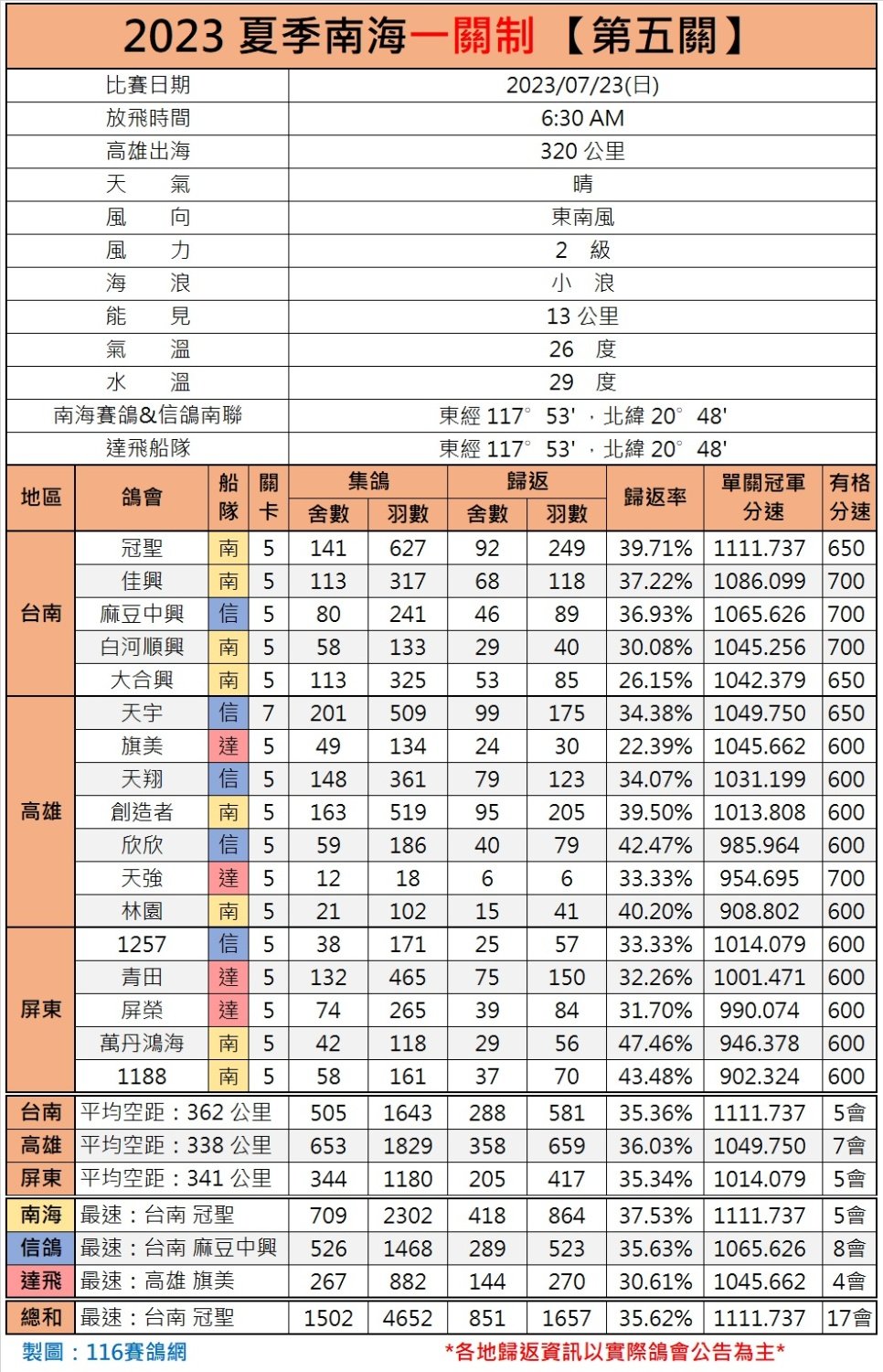经过艰难的飞行以后,累计1657羽赛鸽归来,归巢率仅35.62%,冠军鸽是来自台南冠圣鸽会的一羽赛鸽,分速1111.737米/分。