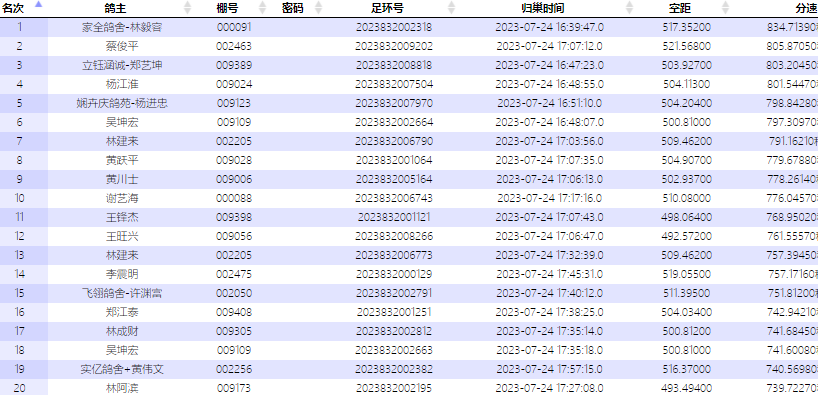 17点07分12秒,蔡俊平的2023832009202赛鸽报进,飞行空距521.5680公里,分速805.8705米/分,获得亚军。16点47分23秒,立钰涵诚-郑艺坤的2023832008818赛鸽,飞行空距500.81公里,分速797.3097米/分,获得季军。