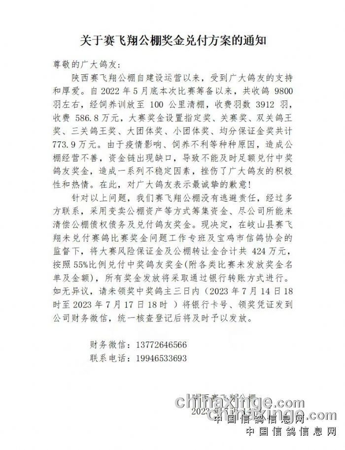 2023年5月23日500公里决赛结束后,公棚仅给一小部分鸽友兑现了比赛奖金,随后公棚发了一个公告,所有比赛获奖鸽奖金5月28日正常发放,接下来发生了什么事情,大家应该都猜到了。所有剩下的获奖鸽都没有兑现奖金。一直到6月9日大部分鸽友去公棚讨要获奖奖金未果,一部分激进鸽友直接去岐山县信访局、县政府讨要说法。此次群体事件引起了岐山县政府部门的高度重视。随即岐山县政府成立了关于赛飞翔公棚赛鸽奖金后续专班,联合岐山县公检法、信访办、雍川镇政府、宝鸡市信鸽协会等部门就赛飞翔赛鸽公棚赛鸽奖金托欠事宜进行调查,妥善处理。最终于7月14日发出了《关于赛飞翔公棚赛鸽奖金兑现方案》通知。虽然很遗憾,也不是很完美。没有完全兑现所有获奖鸽奖金,但是,在政府部门、信鸽协会、赛飞翔公棚一致努力下,让所有获奖鸽主的利益最大化,损失也降到最低。也算是让赛飞翔公棚2023年春季四关大奖赛画上了一个不圆满的句号。