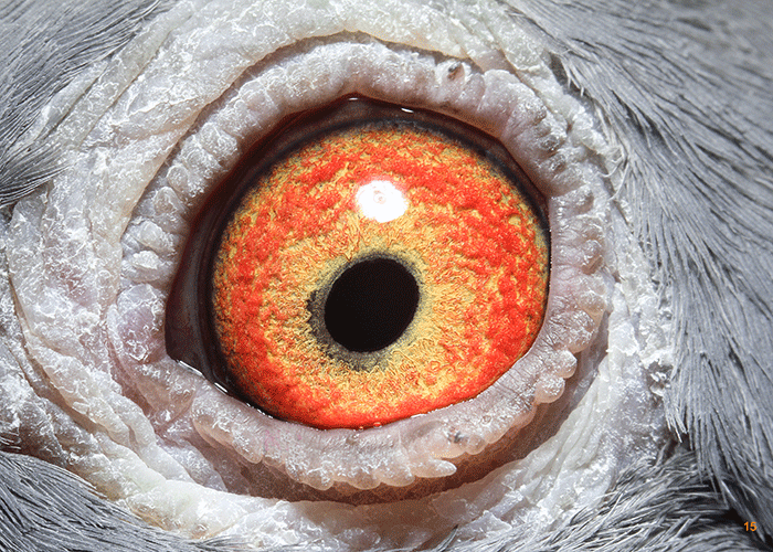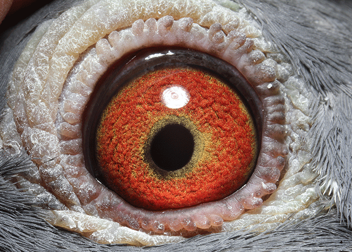 有鸽友看了多年的公棚获奖鸽,总结得出一些经验,认为公棚获奖鸽眼睛有几个特征:底砂饱满,颜色亮彩;面砂由薄向厚逐渐堆积,呈立体感;瞳孔收缩快速有力,鸽眼足够明亮有神,看起来十分锐利。