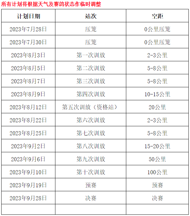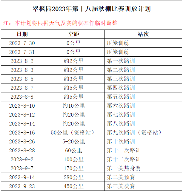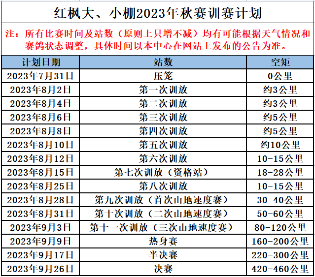 7月31日,翠枫园、红枫大小棚、宏洋、天喜、百鸟缘等秋棚进行压笼或短训。以下是各家公棚秋季训赛计划: