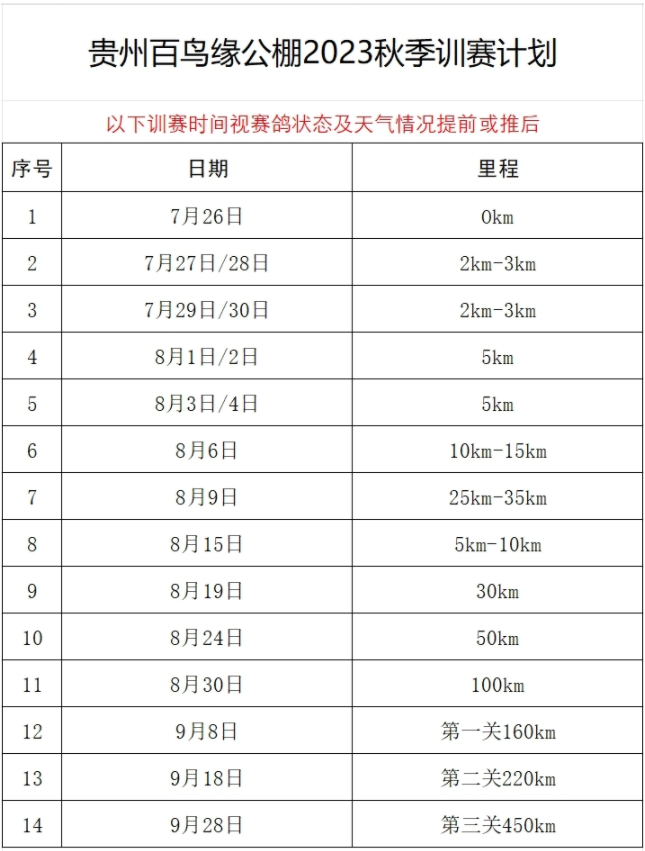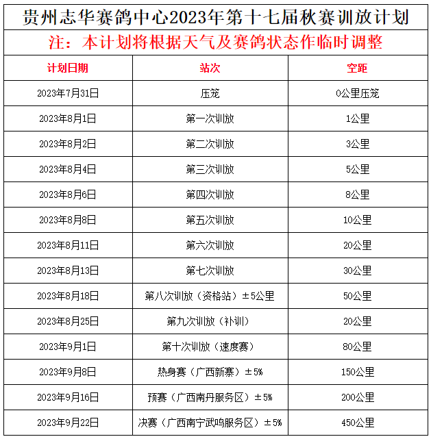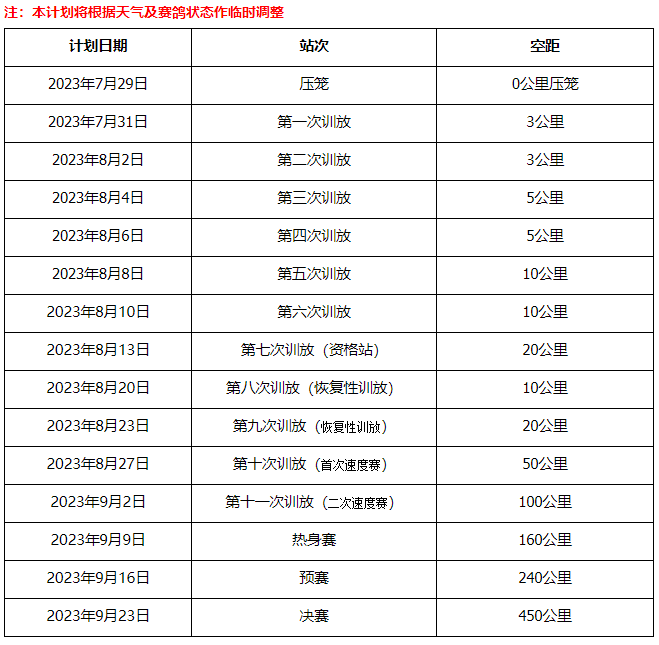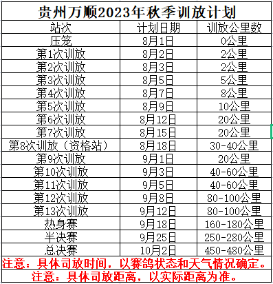 贵州省8家秋棚已公布了2023年训赛计划,全部将在这周开启秋训。根据计划,秋训大约为期1个多月,从0公里压笼开始,循序渐进,训至90或100公里,之后8月中旬进行资格赛,9月份正式打响秋赛第一枪。