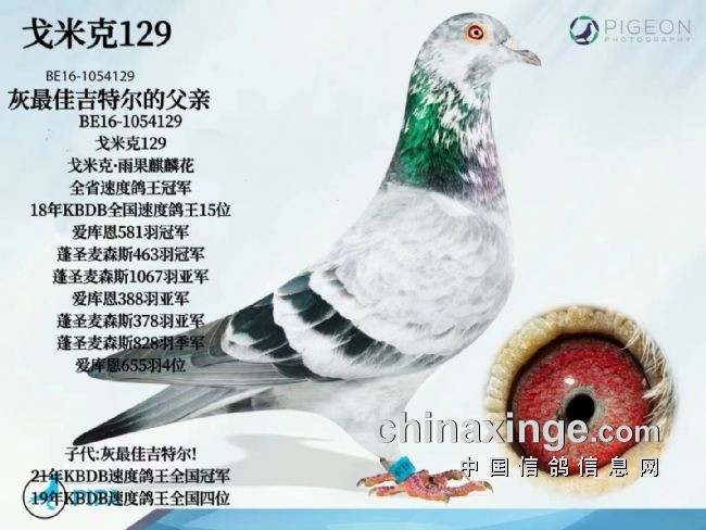 比如:灰最佳吉特尔的父亲“戈米克129”,就是一羽麒麟花,砂眼雄鸽,本身全省鸽王冠军,全国15位。