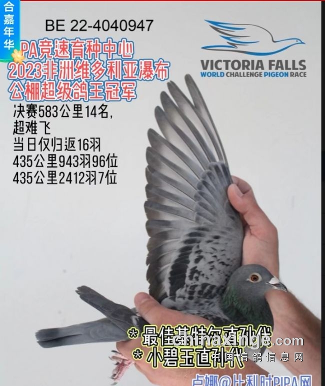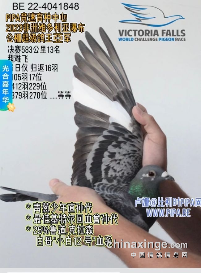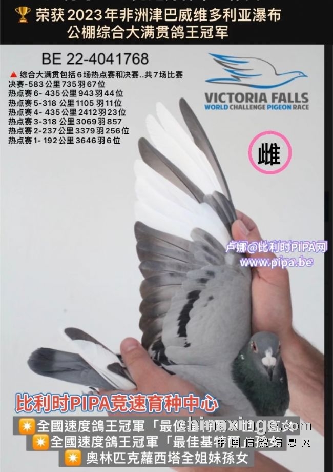 B22-4041768灰花母,“最佳基特尔II世”直女,获得维多利亚瀑布公棚大综合鸽王冠军,超级鸽王6位!