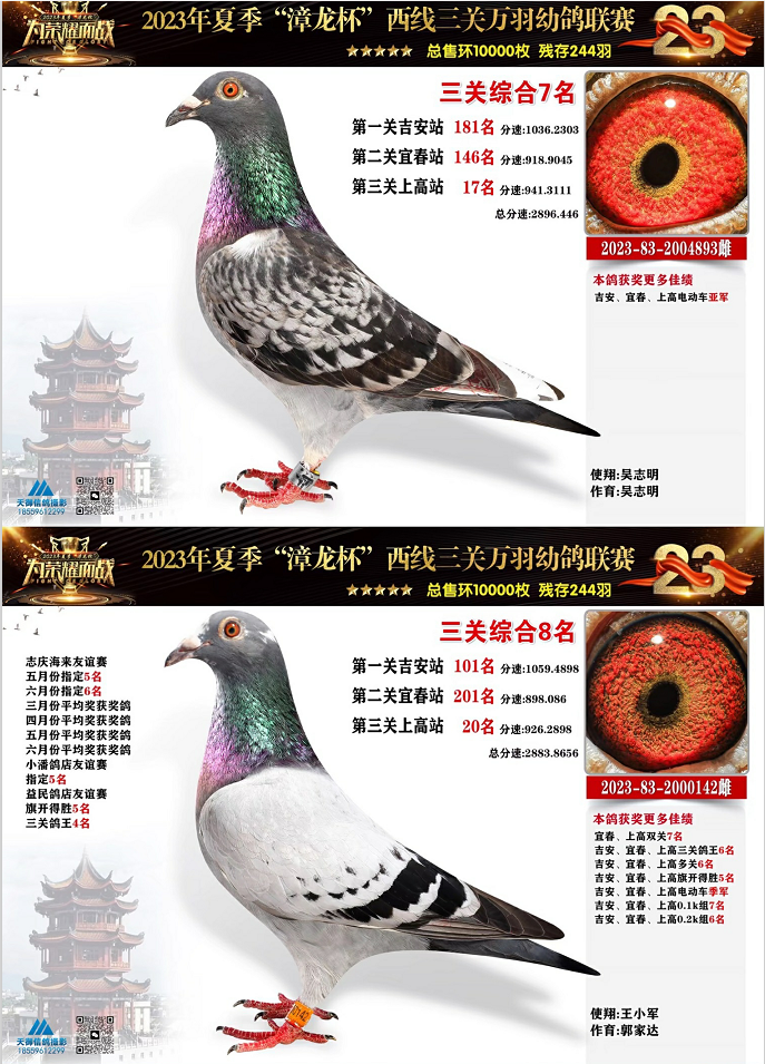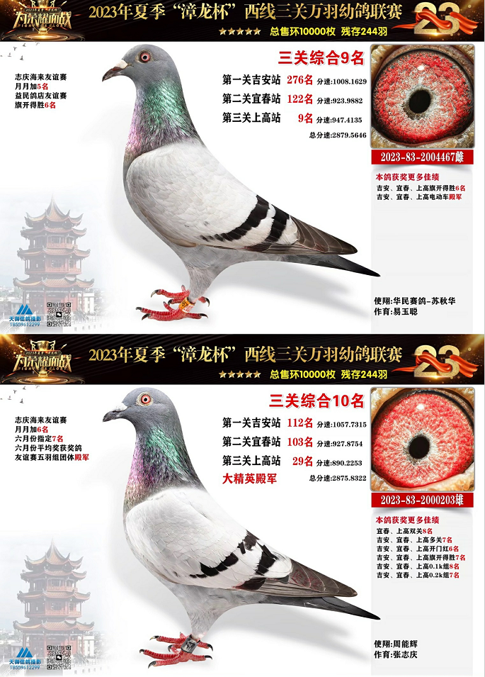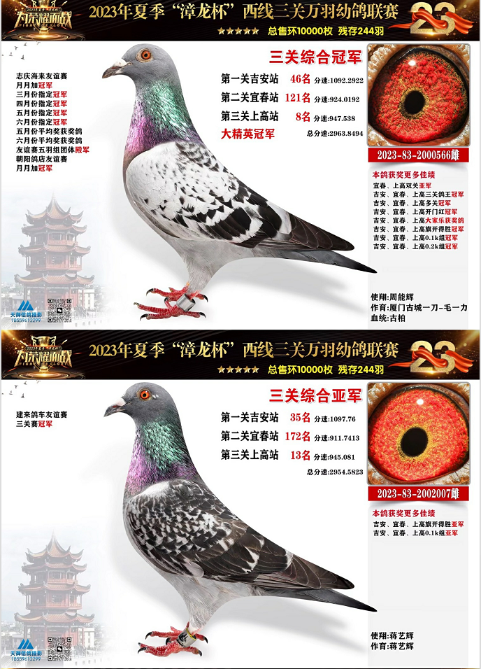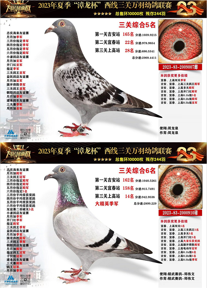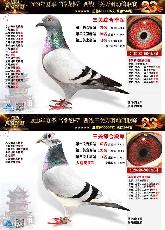 蒋艺辉2023832002007的雌鸽获得三关综合亚军,成绩分别为一关35名、二关172名、三关13名。周龙泉的2023832006923雄鸽三关都在前百名之内,一关30名、二关20名、三关40名,最终拿下三关综合季军,同时也是三关开门红亚军、三关0.5k组冠军、0.2k组亚军、0.1k组季军。