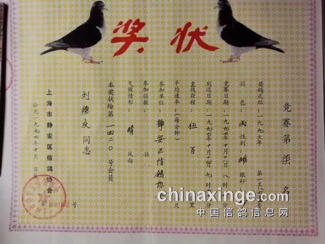 刘先生的培尔琴近快远归。曾参加上海市赛鸽俱乐部,飞500公里录得四名;静安区飞宿州500公里录得三名七名;南路500公里录得七名等;陈丙超拿培尔琴作出的子代,在短距离300/500公里,不乏佳绩入赏。