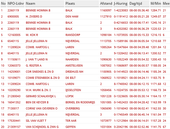 当天19点06分,第一羽报到鸽出现在法国西部,飞行空距738公里,分速为1038米/分。直至20点43分,法国全国冠军顺利诞生,飞行空距863公里,分速1067米/分。比利时全国冠军是8月8日早上5点23分报到,飞行空距991公里,是米尔克&达尔科.米洛维奇(Milovic Mirko & Darko)的BE17-6027138雨点鸽,分速为1097米/分。