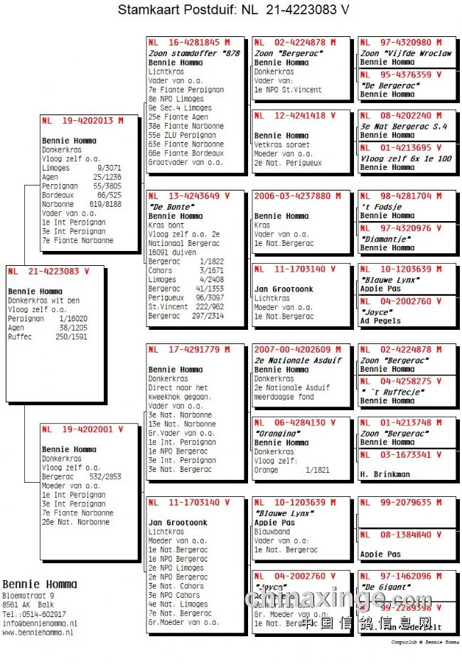 冠军鸽“083”,环号NL21-4223083,本身还获得鲁飞克1591羽250名、阿让1205羽38名。父亲环号NL19-4202013,是一羽超级战鸽,赢得了利蒙治3071羽9名、阿让1236羽25名、波品纳3805羽55名等名次,今年还参加了巴塞罗那的比赛,获得了900多名。母亲环号NL19-4202001,是全国鸽王亚军孙女,平辈获得过NPO贝吉拉克全国冠军、NPO利蒙治全国亚军、NPO卡奥尔季军、利蒙治全国4名、贝吉拉克全国7名等众多奖项。