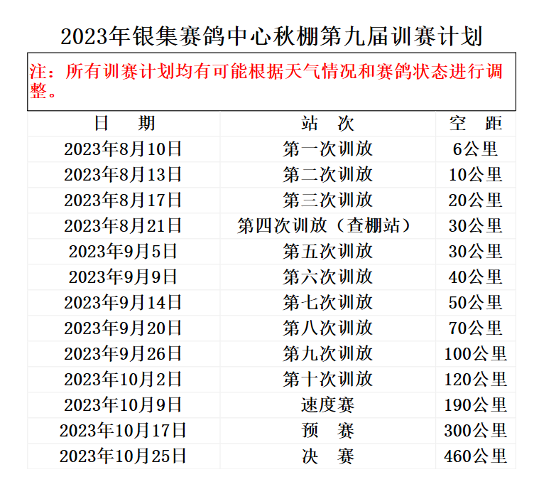 8月7日,云南省宣威市银集赛鸽中心(秋棚)公布第九届训赛计划,训放将于8月上旬开始,到10月初完成,共计训放十站,空距从6公里一直到120公里,随后开启秋季正式比赛。