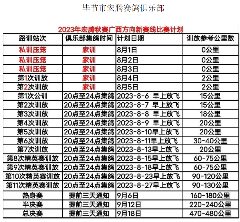 贵州毕节市宏腾赛鸽俱乐部秋赛西训于8月1日开始,连续进行五天的家训后,8月6日开启15公里公训,预计赛前共训放11站。9月6日开启160——180公里热身赛,随后6天赛一场,将于9月中旬完成全部比赛内容。