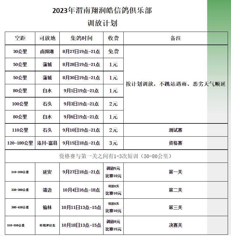 陕西渭南翔润皓信鸽俱乐部秋赛预计训放八站,8月底以30公里起站,一直训到9月中。9月底迎来210——250公里第一关挑战,随后一周打一场,不跳站,各站遇雨或恶劣天气,比赛时间顺延,计划将于10月中结束全部赛事。