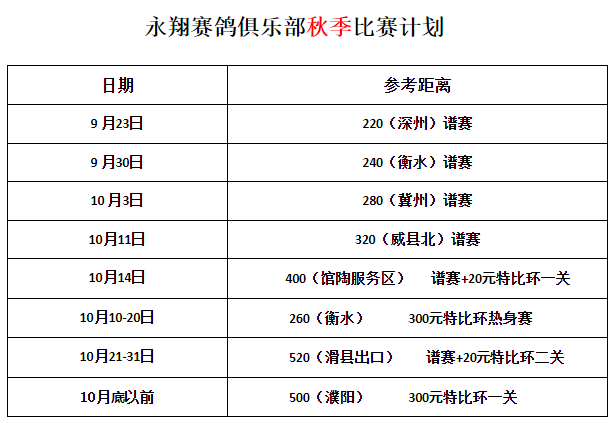 北京永翔赛鸽俱乐部秋季训放同样在9月1日正式开始,起站60公里,到9月20日时,将训放至200公里。9月23日开始四场普赛,空距220——320公里;10月14日开启特比赛,将于10月底前完成全部秋赛计划。