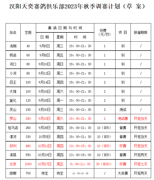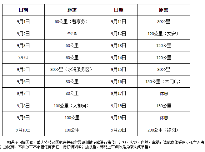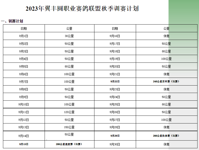 北京市翼丰圆职业赛鸽联盟将于9月2日起开始训赛,首站便是30公里;9月15日开启200公里速度赛挑战;一周后迎来240公里百杯赛,预计将于9月底完成260公里热身赛,随后进入到正式赛。