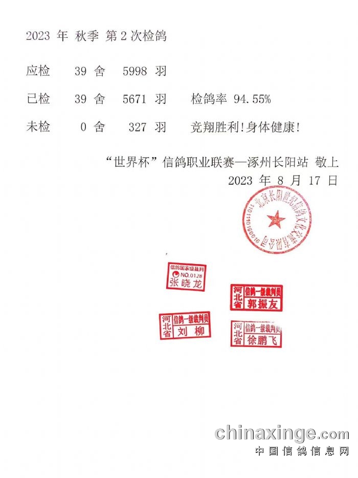 按照竞赛规程规定,本年度参赛鸽第二次检验登记于8月15日、16、17日三天顺利完成,共有39舍5671羽赛鸽通过检验完成登记。