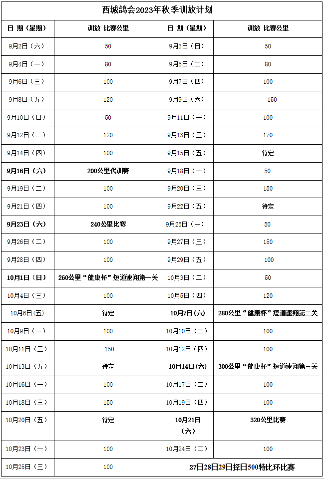 西城鸽会2023年训赛日程表: