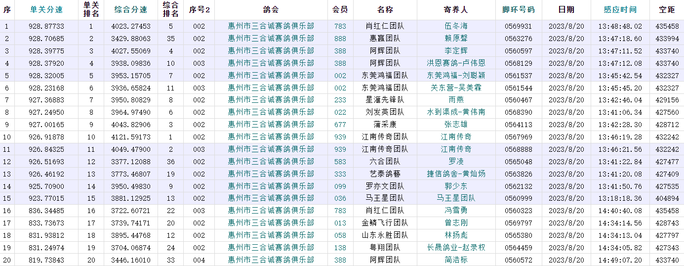 果不其然,当天13点18分,经过7个多小时的飞行,首羽赛鸽才艰难归巢,是马王星团队0560999的赛鸽,分速923.77015米/分,最终排行15名。肖红仁团队伍冬海环号0569931的赛鸽拿下单关冠军,分速928.87733米/分,飞行空距435.458公里;惠赢团队赖原聲0563276的赛鸽获得亚军,分速928.70685米/分,飞行空距433.994公里;阿辉团队李定辉0560597的赛鸽获得季军,分速928.39775米/分,飞行空距433.74公里。