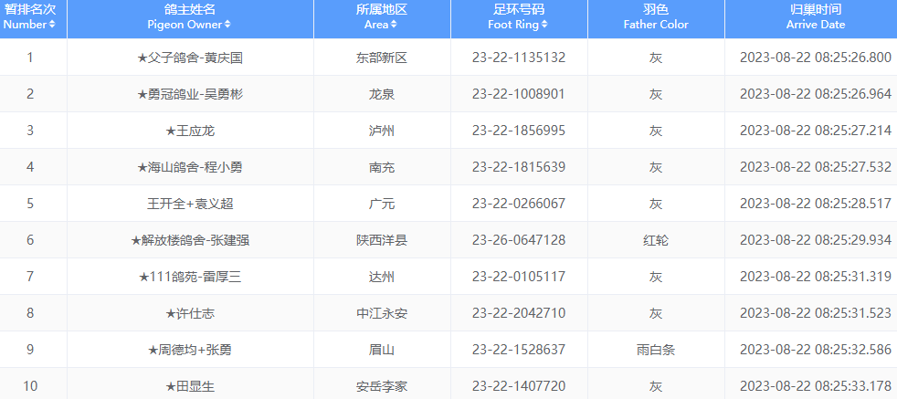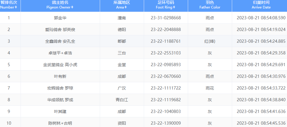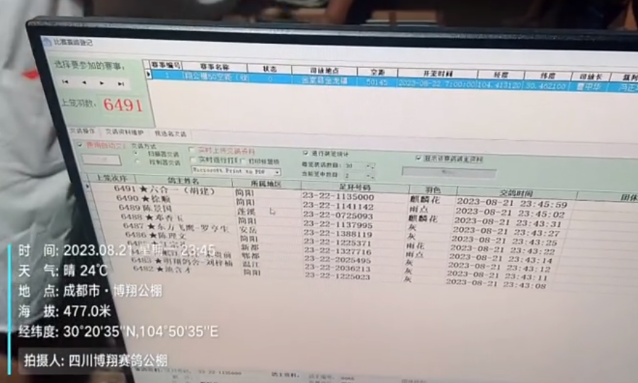 四川博翔赛鸽公棚8月10日首训,经过了3、5、10、18、32公里短训,至8月22日进入50公里清棚收费站,于早上7点38分在金堂县淮口街道南北干道放飞,共计上笼6491羽鸽子。8月25日第一羽赛鸽报到,此后大批赛鸽归巢,至9点30分,已有5900多羽报到。