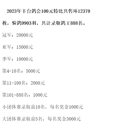 100元特比组共售环12370枚,验鸽9903羽,录取鸽王888名,冠军奖励2万元、亚军1.5万元、季军1万元。