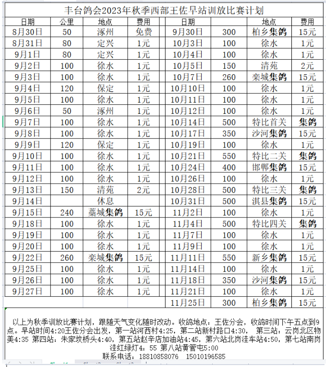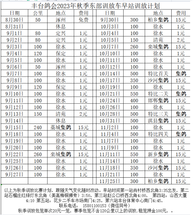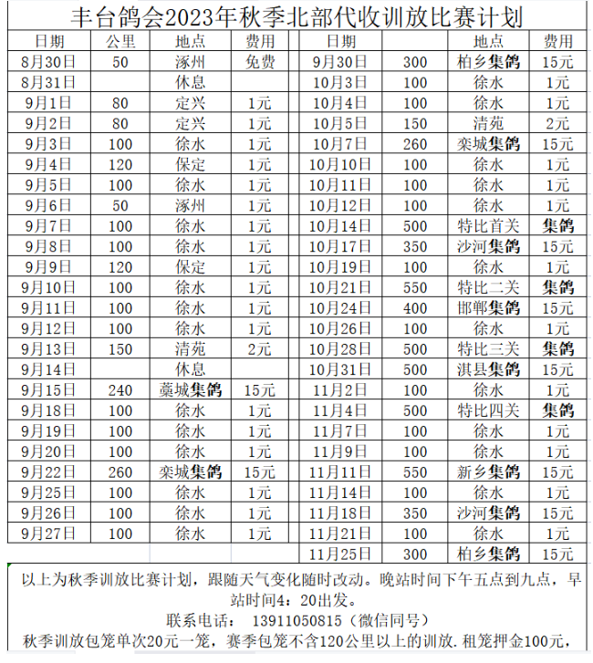 丰台信鸽协会秋季训放比赛计划如下: