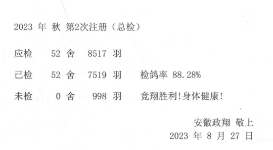 2023年政翔“悍将联盟杯”职业鸽舍公开赛第二次注册(总检)工作于8月26日早上7:00开始,于8月27日下午18:00圆满结束。共有52舍7519羽参赛鸽完成第二次注册(总检),未经第二次幼检的失格赛鸽共计998羽。