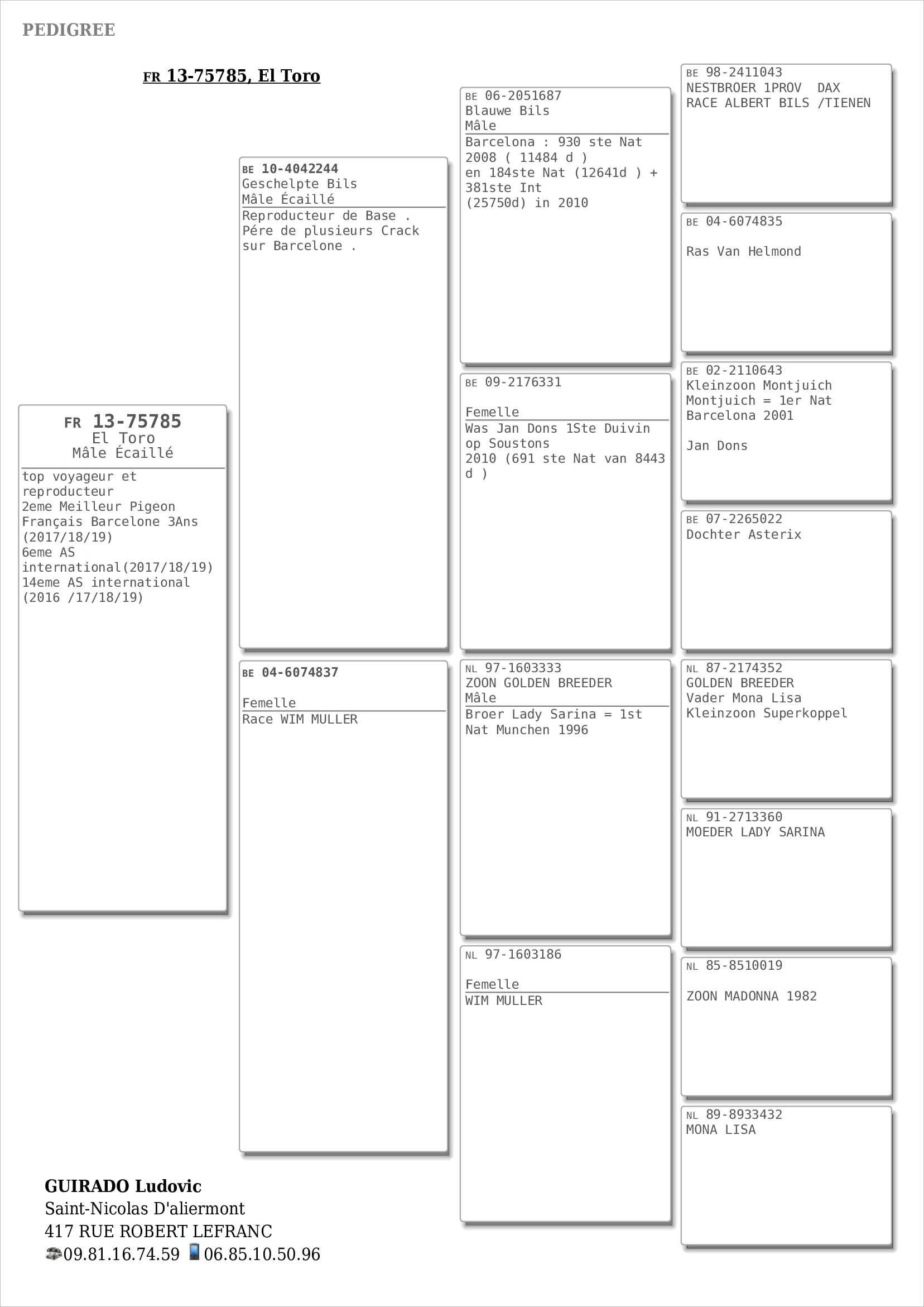 今年吉拉多有多羽赛鸽入围鸽王榜单,获得22-23年两年鸽王殿军,21-23年三年鸽王冠军、九名。其中21-23年三年鸽王九名是一羽11岁龄的老鸽,环号FR13-075785,有7年的巴塞参赛经历,国际赛成绩:16年2882名、17年59名(法国9名)、18年237名(法国49名)、19年673名(法国141名)、21年12名、22年963名、23年61名,还获得17-19年法国鸽王亚军(国际鸽王6名)、16-19年国际鸽王14名。