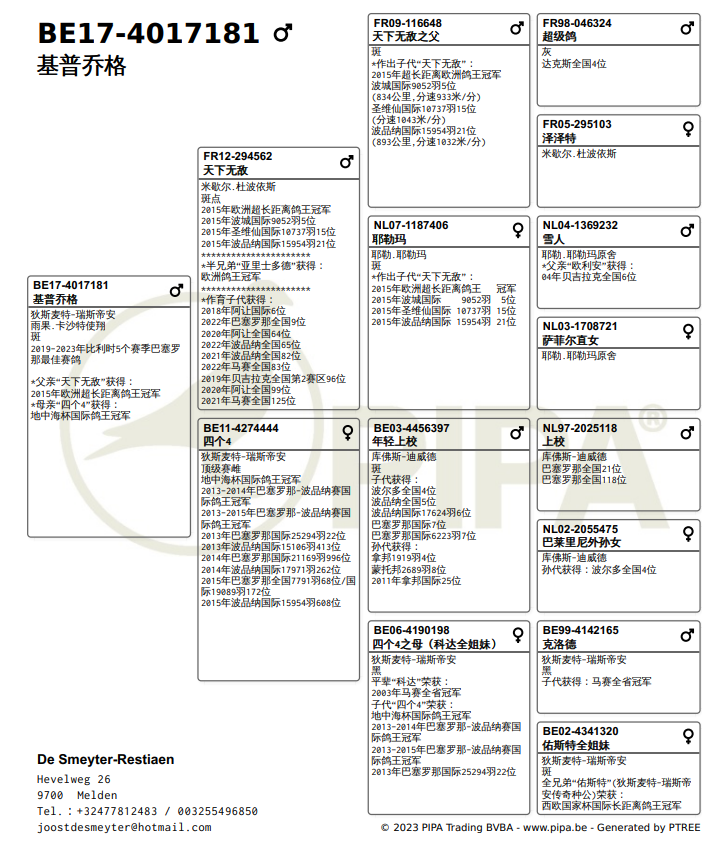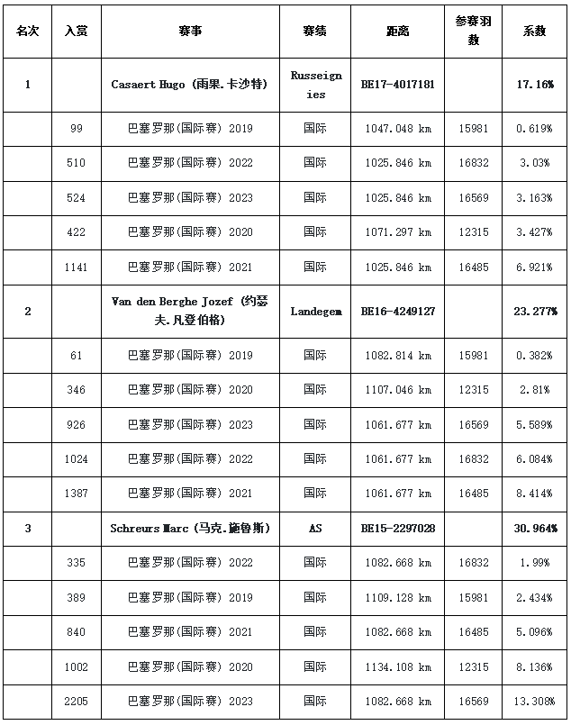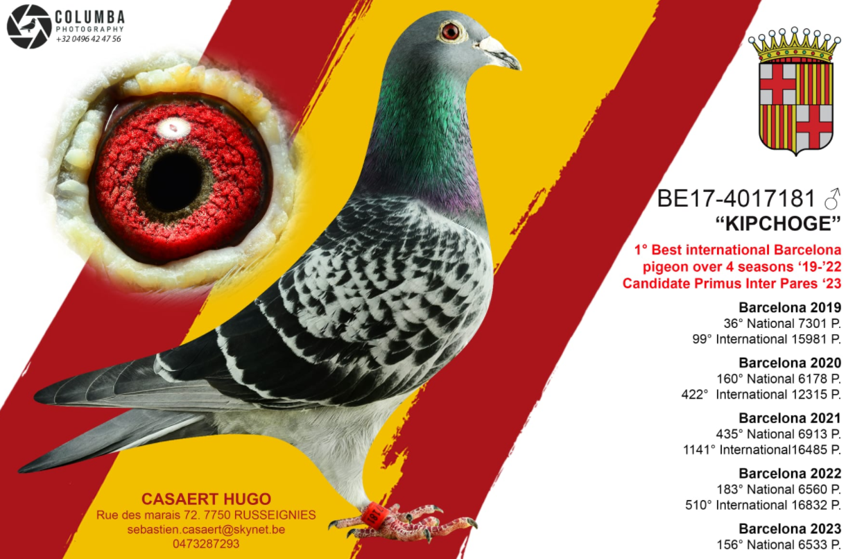 2019-2023年五年鸽王冠军,由比利时雨果·卡沙特的BE17-4017181雨点鸽获得,五年国际赛成绩分别为99、422、1141、510、524名,虽然仅有一年入围前100名,但连续五飞巴塞,也相当不易。