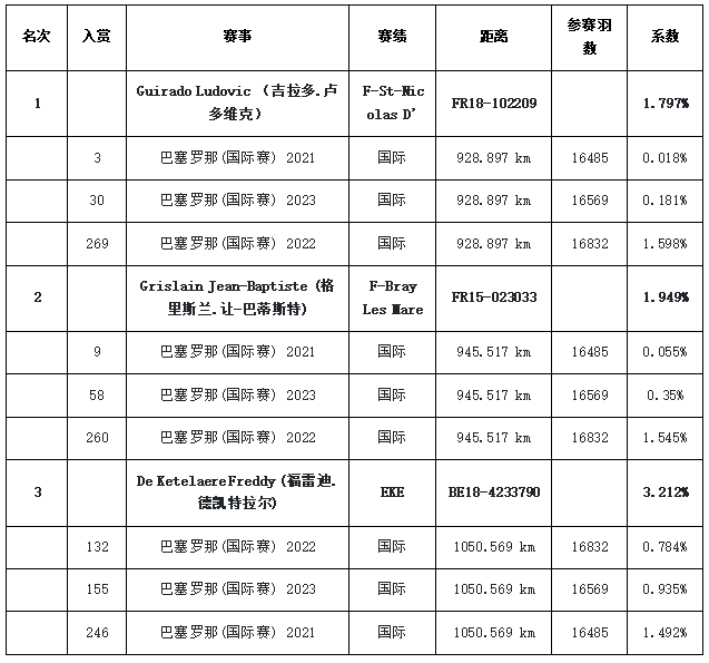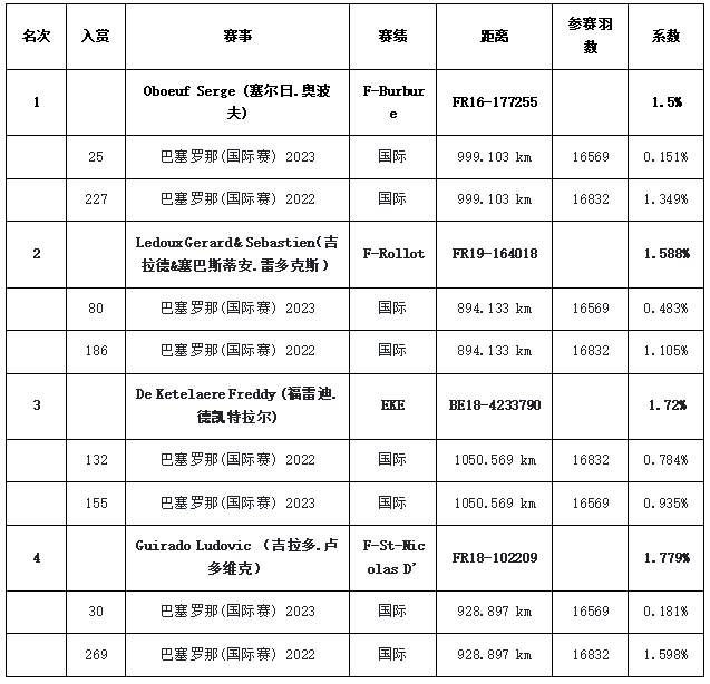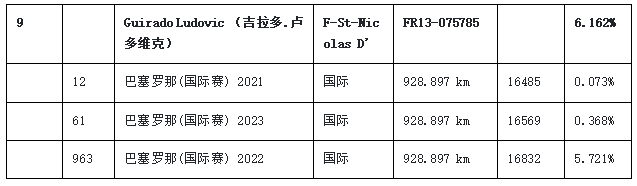 其中,法国著名鸽友吉拉多·卢多维克(Guirado Ludovic),专注于巴塞罗那大赛,今年更是将21年国际季军送上战场,最终获得30名、三年鸽王冠军的好成绩。最近几年,吉拉多的最佳成绩:17年法国9、47、70名;18年法国冠军、13、49名;19年法国21、74、80名;21年法国2、3、4名;23年法国30、61、67名。