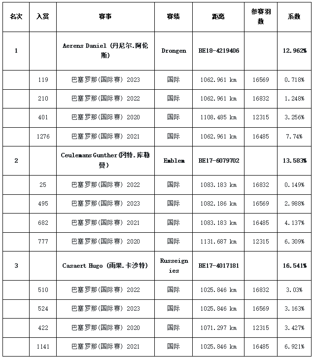 巴塞罗那鸽王冠军,也是鸽友们的参赛目标,为了入围鸽王榜单,他们不惜将获奖鸽连续多年放飞巴塞,甚至八、九岁鸽龄的老鸽也要再上征途!近日,巴塞罗那国际鸽王榜单出炉,2年、3年、4年、5年四个榜单中,比利时狄斯麦特-瑞斯帝安、倚天·梅尔浪、雨果·卡沙特以及法国吉拉多·卢多维克等鸽友名列榜单。