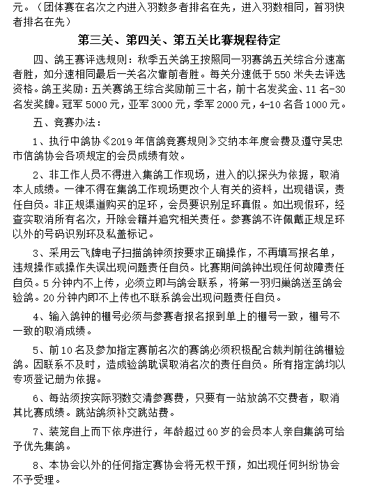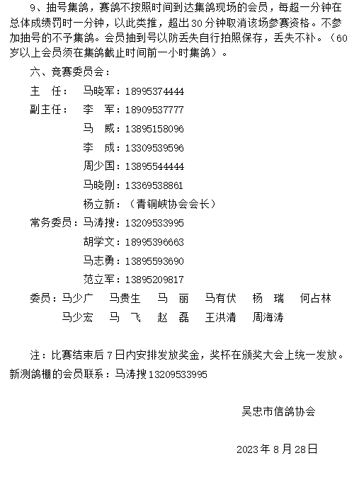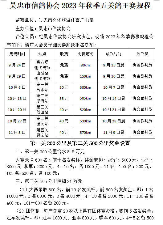 8月28日,宁夏吴忠市信鸽协会公布2023年秋季五关鸽王赛规程。根据规程显示,鸽会将于9月24日开始80公里训放,5天后进行第二次150公里训放。一周后,10月6日正式开始首关300公里正赛,随后一周赛一场,包含二关505公里、三关520公里、四关530公里、五关570公里,至11月8日完成全部比赛。