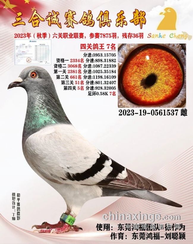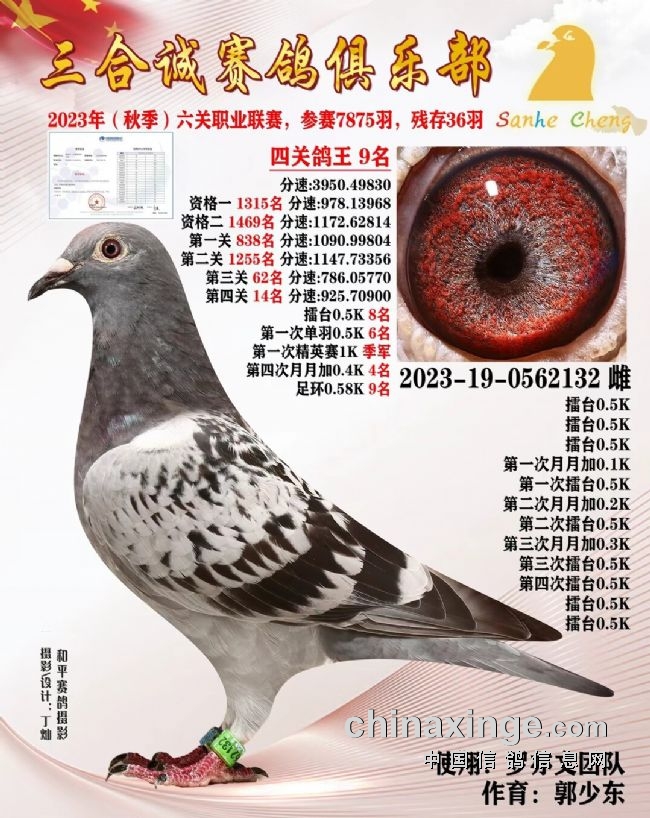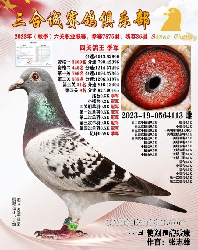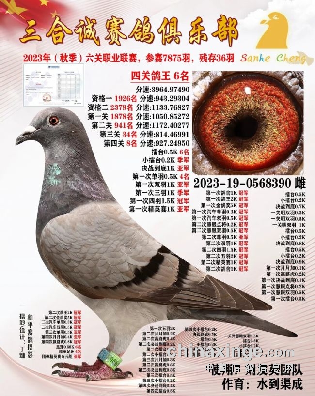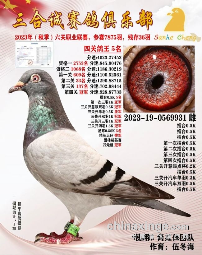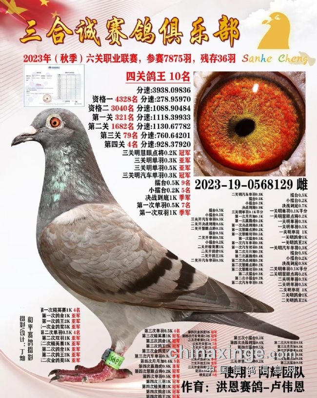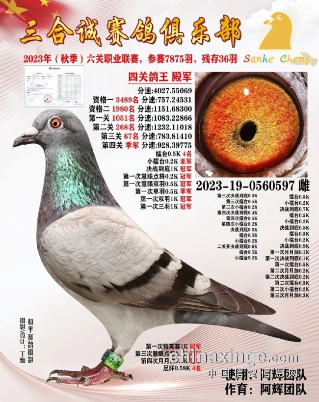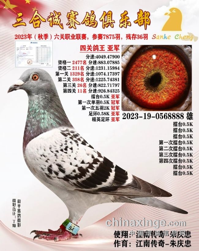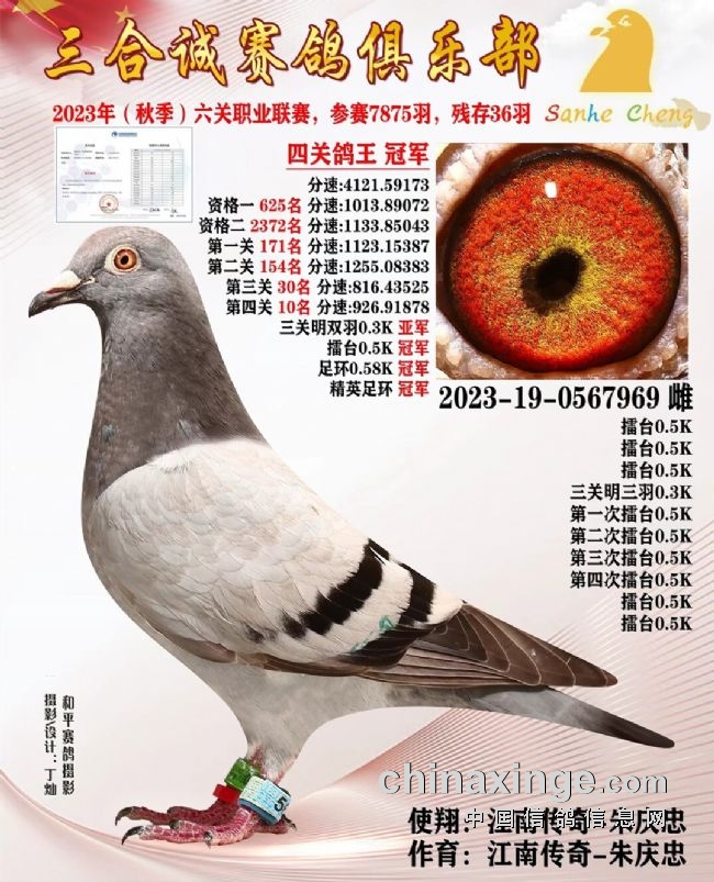 江南传奇环号0567969、0568888的两羽小将,以4121.59173米/分、4049.479米/分的成绩拿下四关综合冠军、亚军,实力非凡;蒲采康团队张志雄0564113的赛鸽拿下四关综合鸽王季军,综合分速为4043.82906米/分。