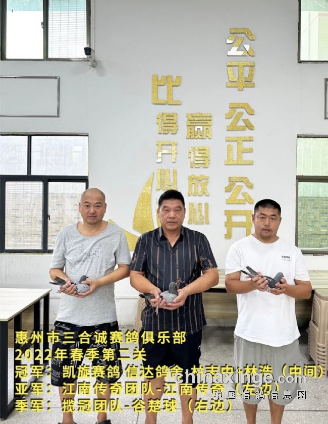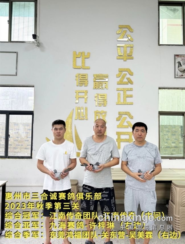 8月15日,第三关比赛在江西万安开笼,空距380公里,有效分速为700米/分。比赛沿途阴雨天气,赛鸽归巢艰难,最终仅有149羽参赛鸽顺利回归。凯旋赛鸽团队信达鸽舍-林志中+林浩0560831的赛鸽获得冠军;江南传奇0568803的小将获得亚军;谷楚球0560091的爱将获得季军。