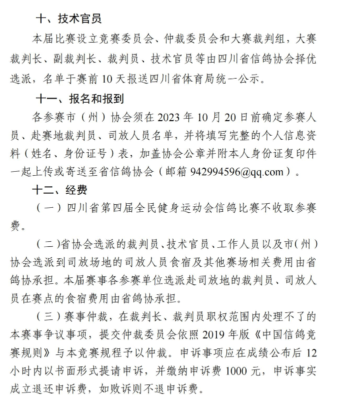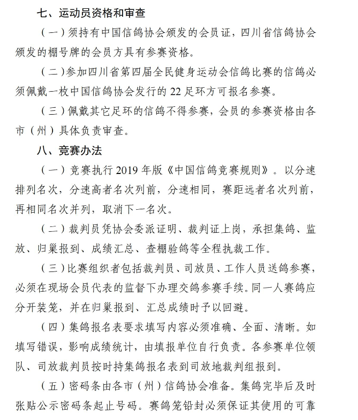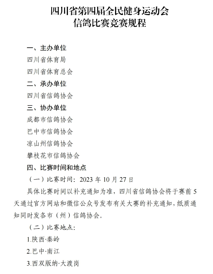 随着各地秋赛逐渐打响,近期四川省信鸽协会发布关于《四川省第四届全民健身运动会信鸽比赛竞赛规程》通知,为即将到来的金秋竞赛季提前预热。