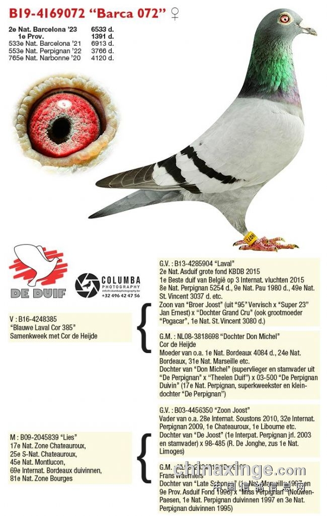 “Barca 072”,环号BE19-4169072,砂眼雨点雌鸽,获得2023年巴塞罗那全国6533羽亚军、1391羽省冠军。它的血统十分优秀,祖父“Laval”,是2015年KBDB超长距离鸽王亚军,获得波品纳8名、波城9名、圣维仙49名。祖母是荷兰长距离名家科尔海德大名鸽“米歇尔”的女儿。母亲这边的血统,出现有2003年波品纳冠军“佑斯特”、法兰斯·瓦尼尔斯的马赛冠军、波品纳冠军的身影。