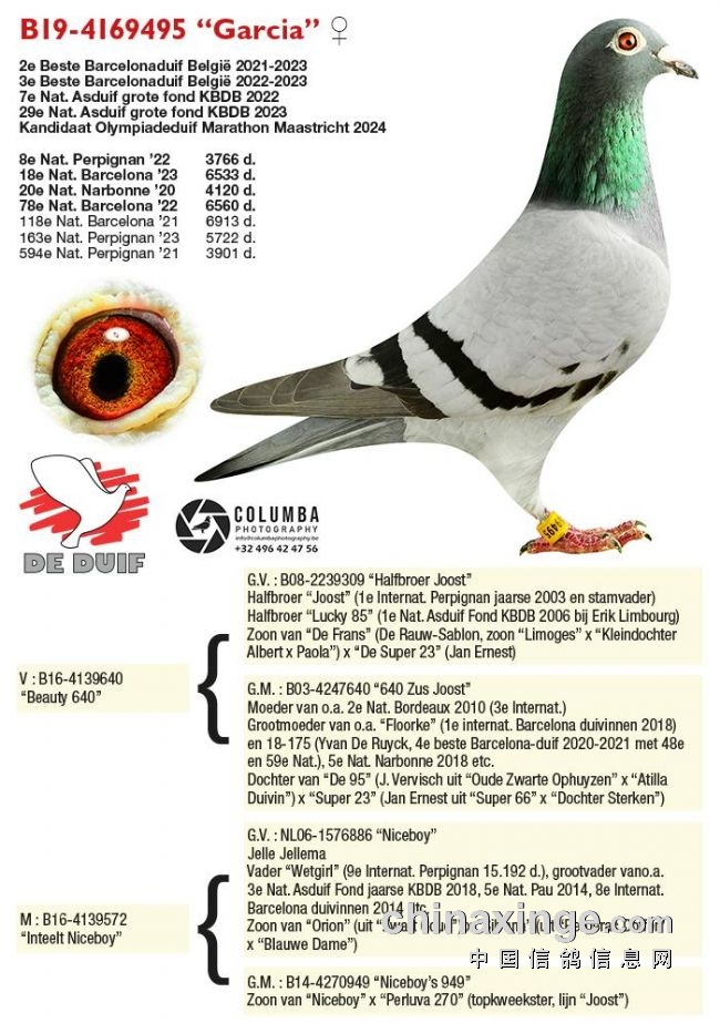 “Garcia”的血统也是相当出色的,父亲是2003年波品纳冠军“佑斯特”血系近亲作育所出,是“佑斯特”同父异母的兄弟。母亲是荷兰名家耶勒·耶勒玛种公“Niceboy”的近亲女儿,“Niceboy”作育过多羽国际赛前十名鸽子。