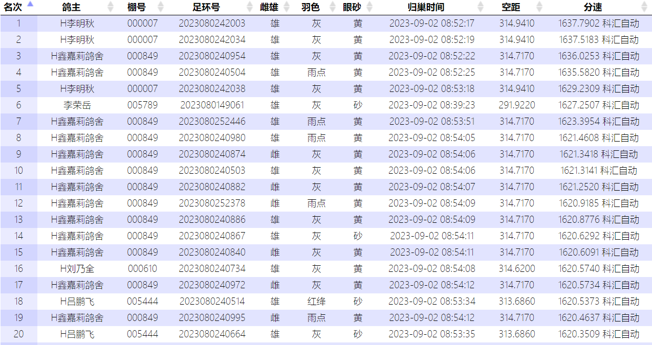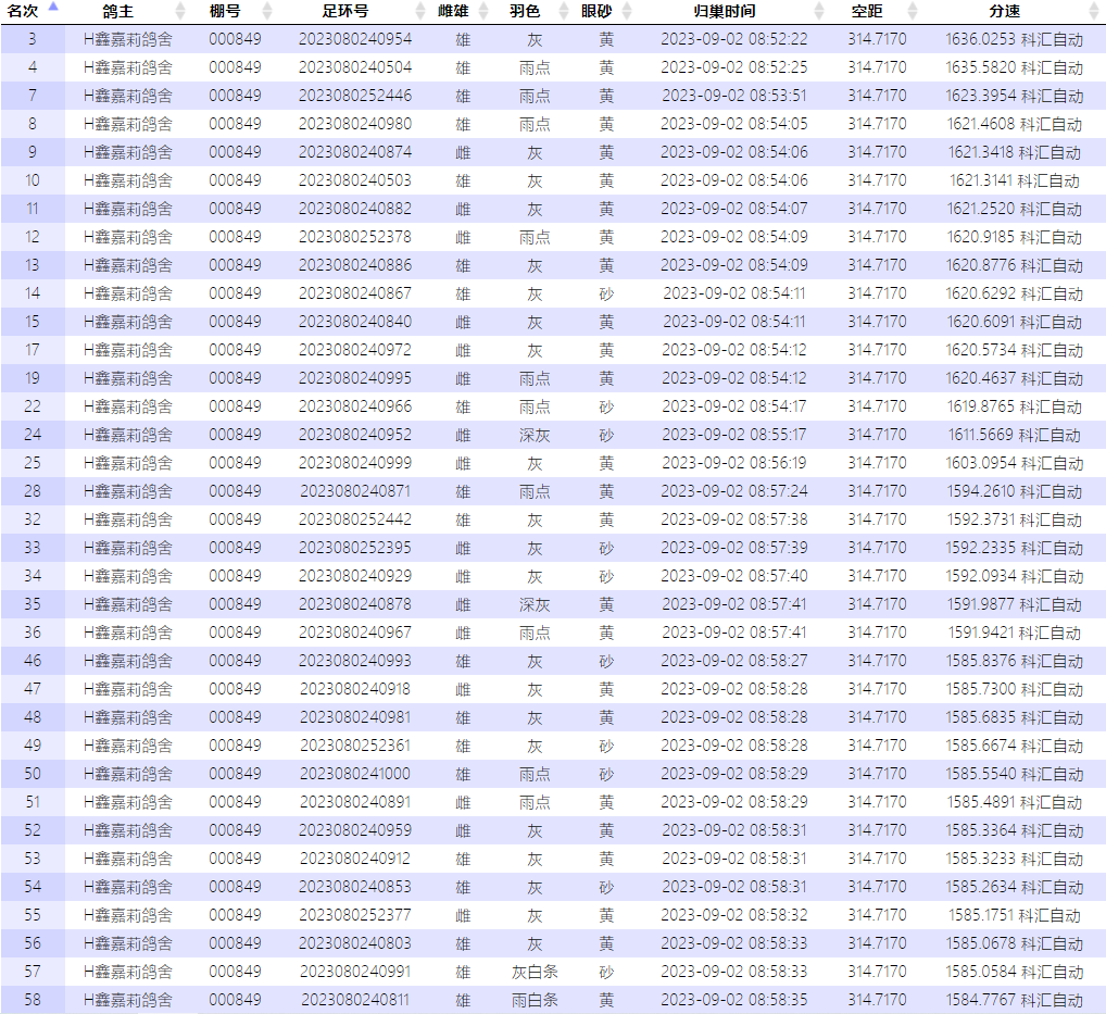 开笼不到三小时,上午8点32分,飞翔鸽苑2023080242098的灰雄踏响鸽钟,分速1591.9151米/分,最终排名37位。