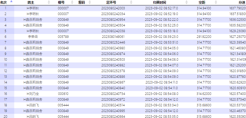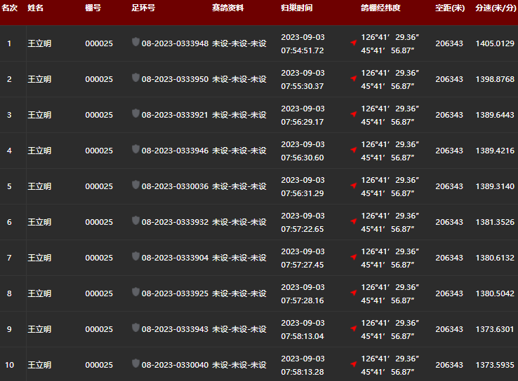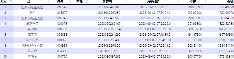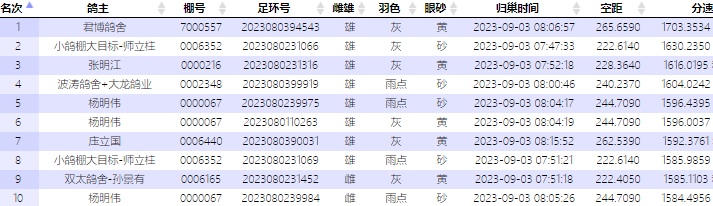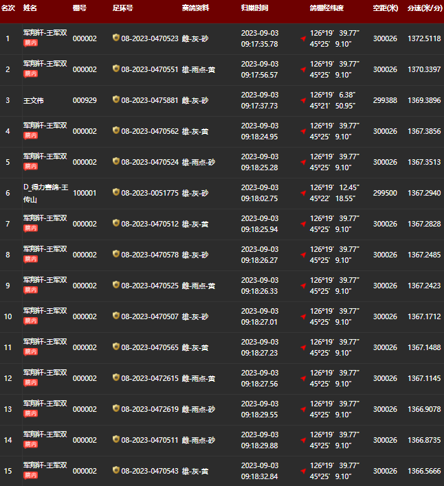 各家鸽会前名次报到数据: