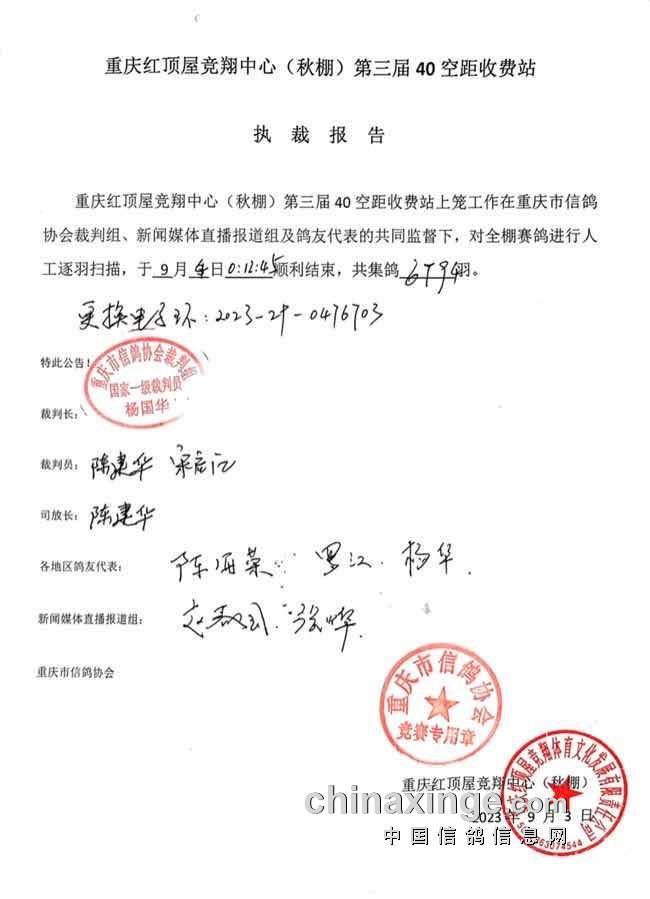 重庆红顶屋竞翔中心(秋棚)第三届40公里收费站上笼工作,在重庆市信鸽协会裁判组、新闻媒体直播报道组及鸽友代表的共同监督下,对全棚赛鸽进行人工逐羽扫描,于2023年9月4日00点12分45秒结束,共计集鸽6794羽。