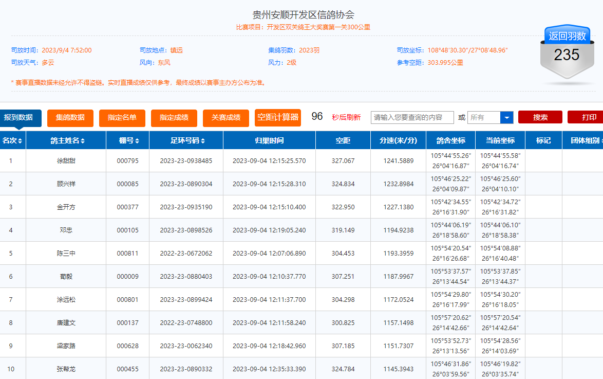 9月4日上午7点52分,贵州安顺开发区信鸽协会大奖赛第一关300公里在镇远开笼,共计上笼2023羽,放飞地天气多云,有两级东风。截至5号上午9时,仅归232羽,归巢率11.4%,徐甜甜环号0938485的赛鸽拿下冠军,分速1241.5889米/分。详细归巢情况>>