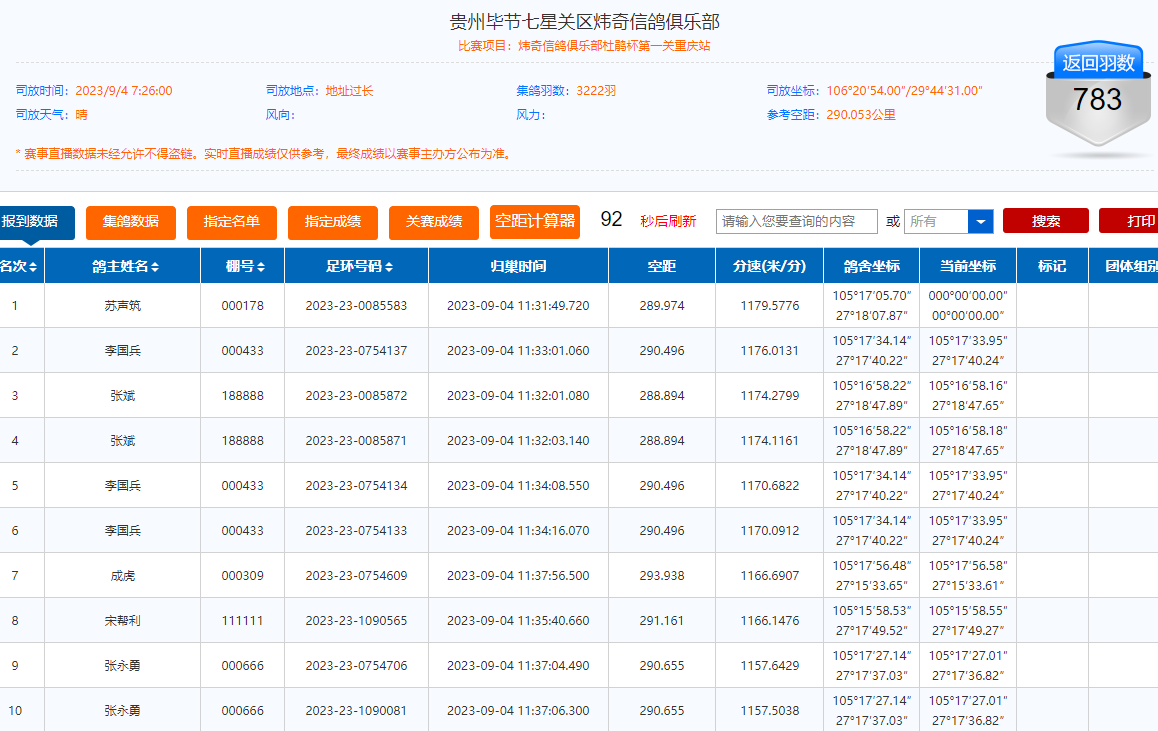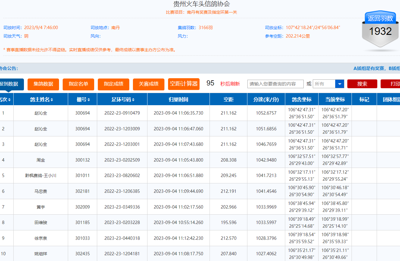 9月4日上午7点46分,贵州火车头信鸽协会南丹有奖赛及指定环第一关顺利开笼,共计3166羽赛鸽上笼参,参考空距202公里,放飞地天气阴,司放广西赛线。截至5号上午9时,累计归巢1900多羽,归巢率60.3%,赵沁全一人包揽冠亚季军,其中冠军分速为1052.6757米/分。详细归巢情况>>