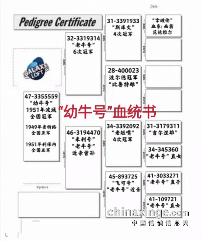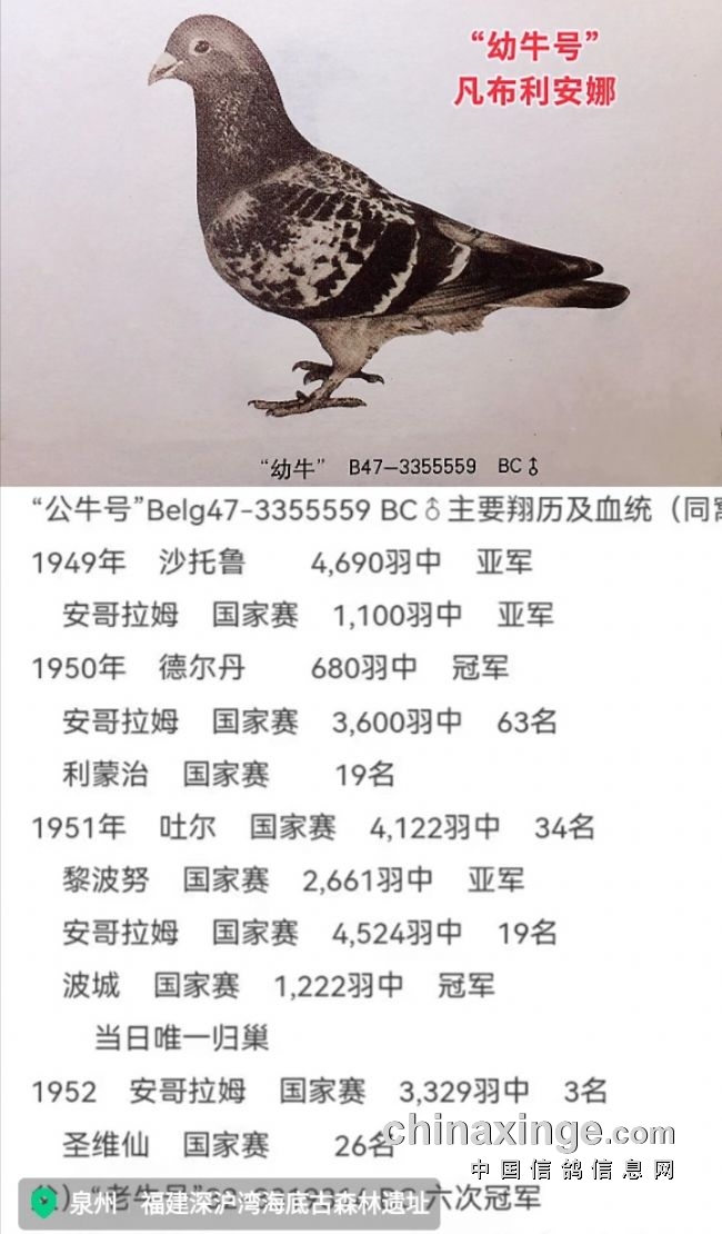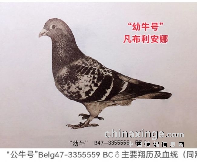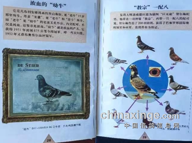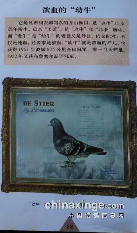 浓血的“幼牛”:它是凡布利安娜鸽系的开山鼻祖,是“老牛”15岁那年所生。母亲“美蕾”,是“老牛”和“菲卡”所生。而“老牛”是“幼牛”的老爸又是外公。内交配对,不仅是纯血,还要求是浓血,“幼牛”就是浓血的产儿,它获得1951年波城875公里全国冠军、唯一当天归巢。1952年又获布鲁塞尔品评冠军。