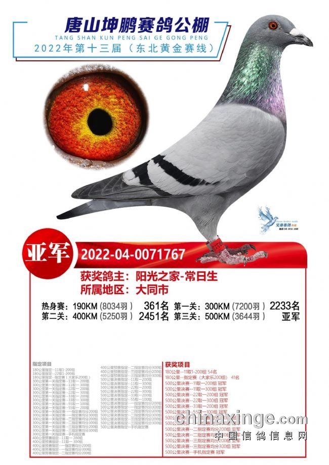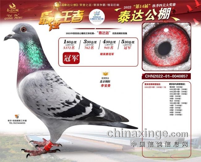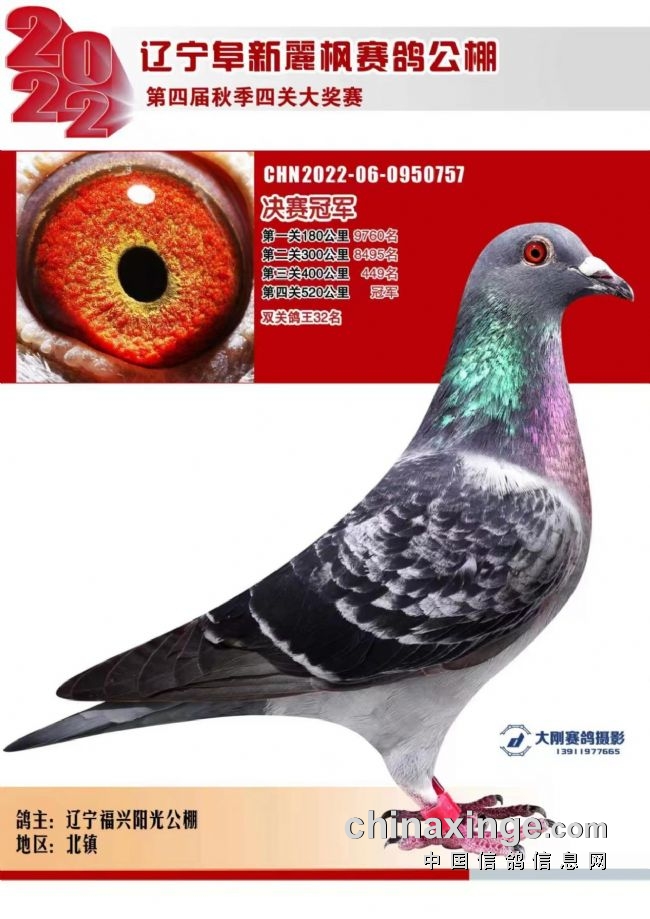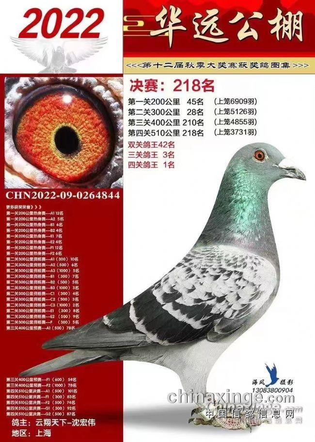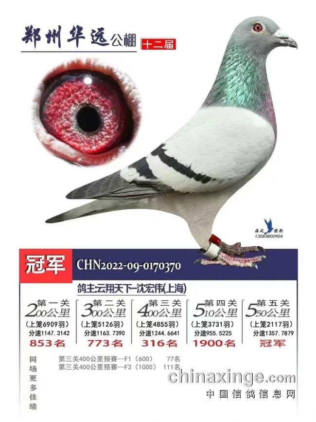 这一可以称得上是天作之合的梦幻配对,因为有18年北京开创季军、亚军,17年长胜寄养棚5名,20年山西神齐8名,21年天津天立决赛亚军等优秀赛绩珠玉在前,由此坚定了沈总引进这羽赛将的决心。22年844诞生,一举拿下华远公棚双关鸽王42名,三关鸽王季军,四关鸽王冠军,成为新一代明星战鸽!