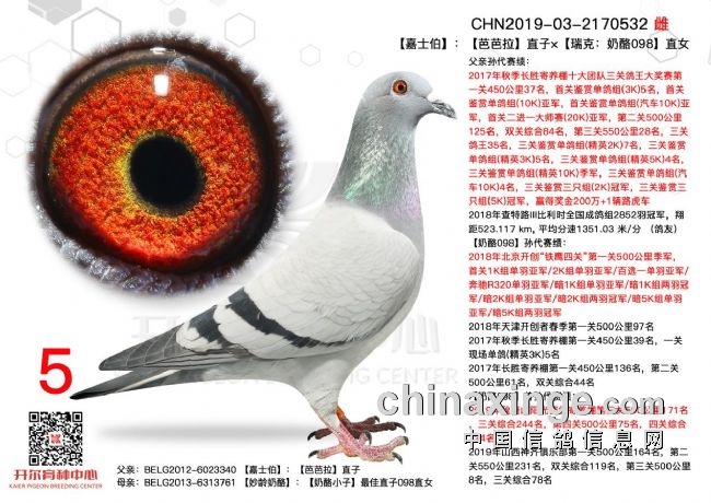 这羽赛鸽的母亲是代总自开尔引进开尔经典配对结合后代!它的外祖母是经典配对之首乐平与公主480结合作育,结合开尔主打血系杨欧瓦克!