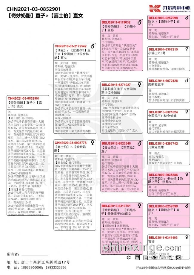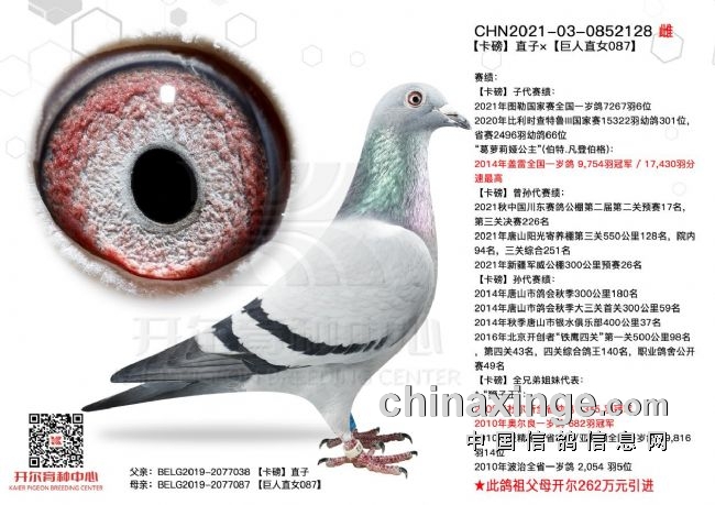 这羽赛将出自开尔主打血系奶酪家族,它的母亲是何总自开尔引进的嘉士伯与奶酪小子最佳直子瑞克098直女的结合,而嘉士伯和瑞克098直女作为葛斯顿先生最看好的配对之一,其后代不仅在国外斩获查特鲁冠军、KBDB鸽王4位,在国内赛场也可以说占尽锋芒,斩获华远公棚四关鸽王冠军、西安慧能预赛27名、呼和浩特勇敢者俱乐部四关鸽王16名等等,在唐山阳光、贵州黔南、天津等国内赛线均有高位发挥。