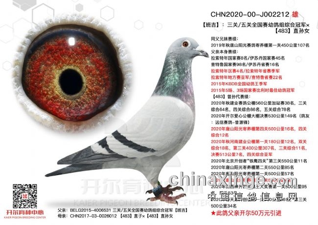 这羽赛将与开尔有些解不开的渊源!它的父亲是常总拍回的开尔公棚大棚赛绩鸽,斩获大棚决赛203名!