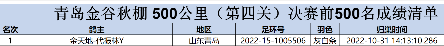 秋赛黑马可不止这一羽,是山东鸽友代振林选送参赛的一羽战鸽,在去年的金谷公棚比赛中,它在前三关的表现都是成绩平平,没有落后也没有挤进前奖,而就在10月31日决赛开笼当天,这羽赛将在10456羽竞翔战将中以1152米/分的分速冲上冠军宝座,成为本场比赛冲出的黑马!